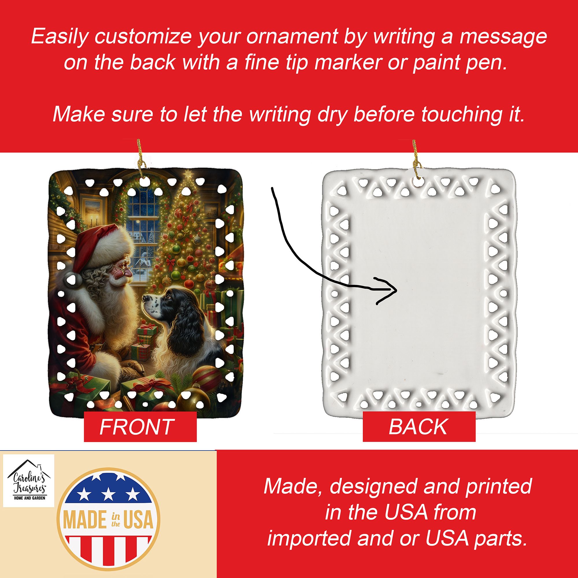 Porcelain Ornament featuring breed specific English Springer Spaniel artwork. Celebrate Christmas with this Christmas Ornament. Add a unique, personal touch to your holiday decor with our Rectangular Lattice Porcelain Ornament. Perfect for creating cherished memories, this high-quality ornament shines under festive lights, reflecting warmth and joy throughout your Christmas tree. Crafted with a glossy finish, it showcases vibrant, full-color artwork contributed by our talented artists, ensuring your tree is adorned with a burst of color and holiday spirit. What sets this Porcelain Ornament apart is its customizable white back. Use a paint pen or permanent marker to write a heartfelt message, commemorate a special year, or mark an unforgettable date, turning this ornament into a keepsake that will be treasured for years to come. For best results, allow any personalization to dry thoroughly before handling. Each ornament comes complete with a delicate gold cord, making it easy to hang and display. Proudly made in the USA, this ornament measures 3.375 x 2.625 inches and is a thoughtful gift for pet sitters, teachers, family members, or anyone who would appreciate a little extra holiday magic. Bring style, charm, and a touch of personal meaning to your Christmas tree with this beautifully designed ornament..