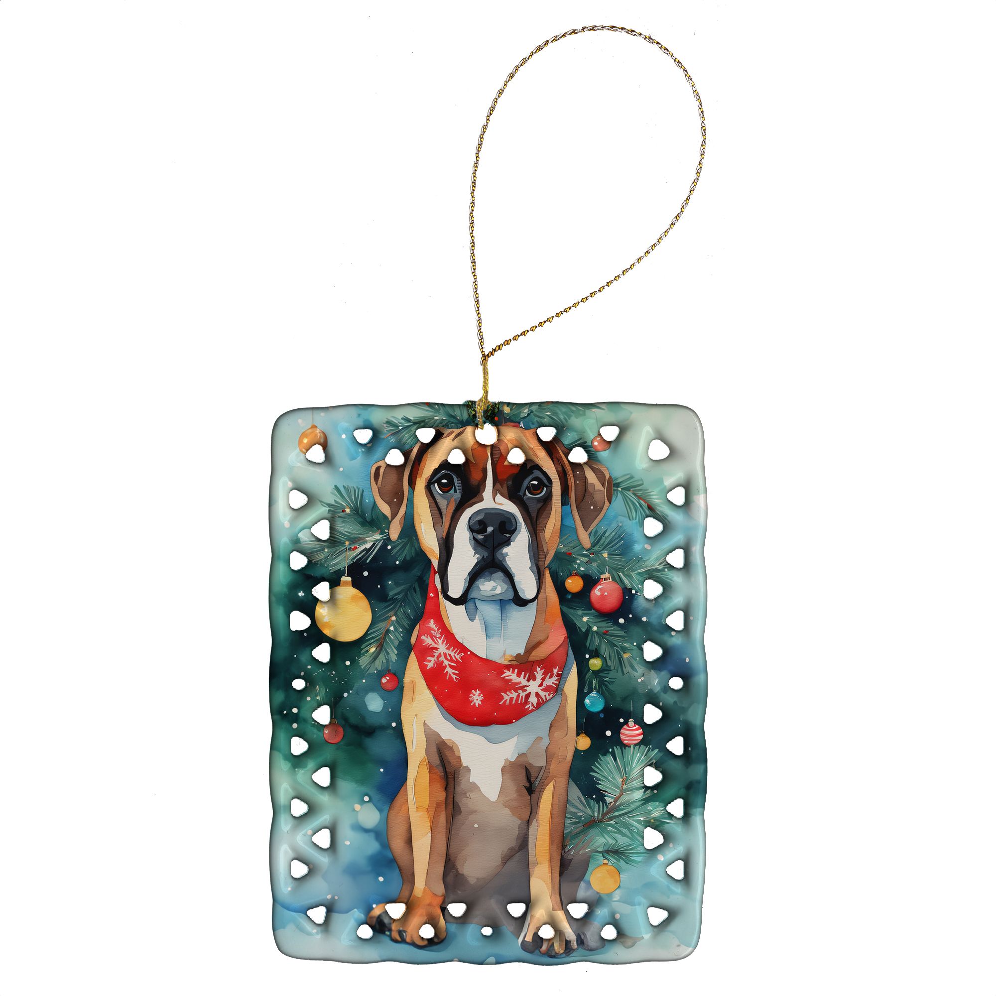 Porcelain Ornament featuring breed specific Boxer artwork. Celebrate Christmas with this Christmas Ornament. Add a unique, personal touch to your holiday decor with our Rectangular Lattice Porcelain Ornament. Perfect for creating cherished memories, this high-quality ornament shines under festive lights, reflecting warmth and joy throughout your Christmas tree. Crafted with a glossy finish, it showcases vibrant, full-color artwork contributed by our talented artists, ensuring your tree is adorned with a burst of color and holiday spirit. What sets this Porcelain Ornament apart is its customizable white back. Use a paint pen or permanent marker to write a heartfelt message, commemorate a special year, or mark an unforgettable date, turning this ornament into a keepsake that will be treasured for years to come. For best results, allow any personalization to dry thoroughly before handling. Each ornament comes complete with a delicate gold cord, making it easy to hang and display. Proudly made in the USA, this ornament measures 3.375 x 2.625 inches and is a thoughtful gift for pet sitters, teachers, family members, or anyone who would appreciate a little extra holiday magic. Bring style, charm, and a touch of personal meaning to your Christmas tree with this beautifully designed ornament..