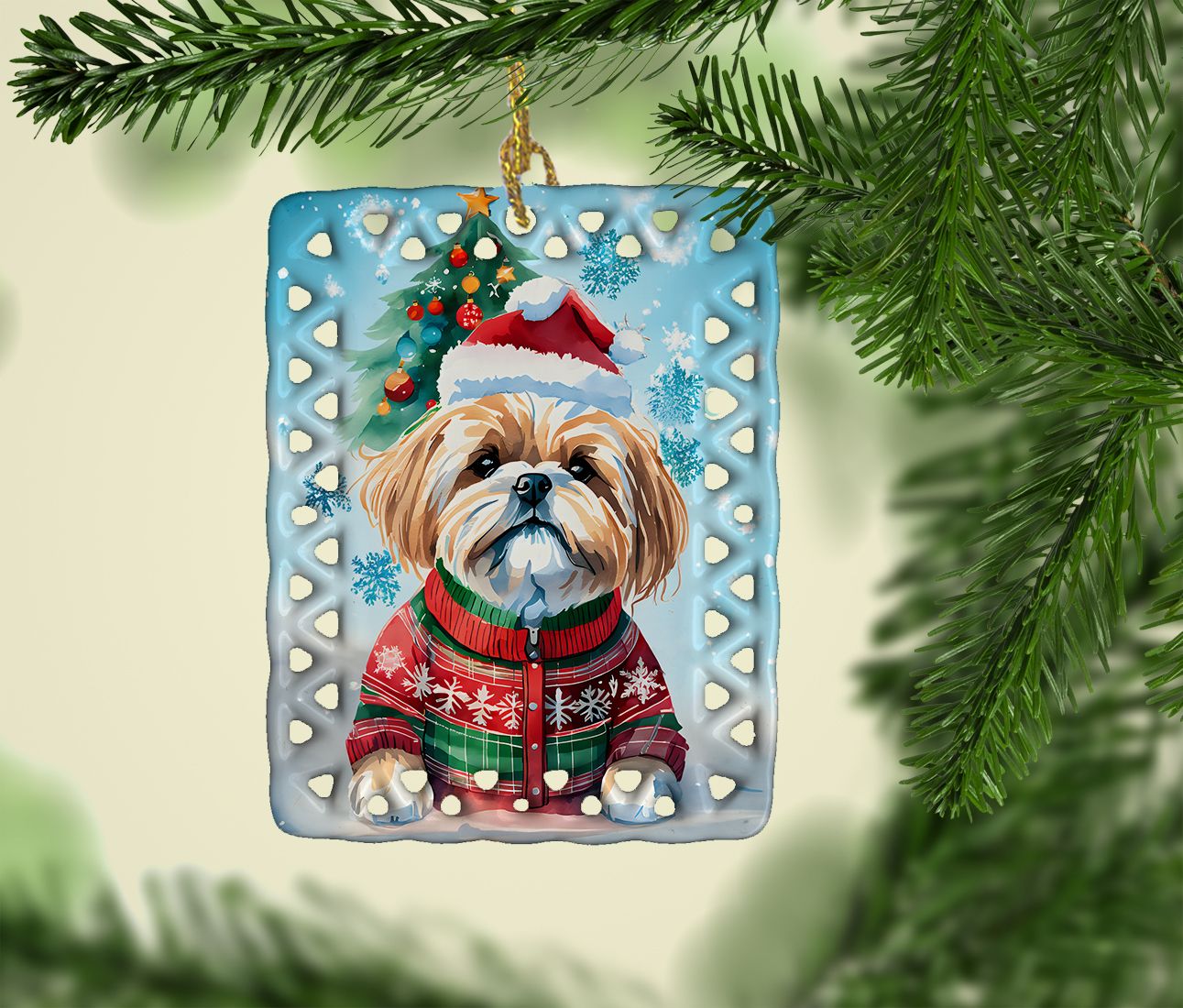 Porcelain Ornament featuring breed specific Lhasa Apso artwork. Celebrate Christmas with this Christmas Ornament. Add a unique, personal touch to your holiday decor with our Rectangular Lattice Porcelain Ornament. Perfect for creating cherished memories, this high-quality ornament shines under festive lights, reflecting warmth and joy throughout your Christmas tree. Crafted with a glossy finish, it showcases vibrant, full-color artwork contributed by our talented artists, ensuring your tree is adorned with a burst of color and holiday spirit. What sets this Porcelain Ornament apart is its customizable white back. Use a paint pen or permanent marker to write a heartfelt message, commemorate a special year, or mark an unforgettable date, turning this ornament into a keepsake that will be treasured for years to come. For best results, allow any personalization to dry thoroughly before handling. Each ornament comes complete with a delicate gold cord, making it easy to hang and display. Proudly made in the USA, this ornament measures 3.375 x 2.625 inches and is a thoughtful gift for pet sitters, teachers, family members, or anyone who would appreciate a little extra holiday magic. Bring style, charm, and a touch of personal meaning to your Christmas tree with this beautifully designed ornament..