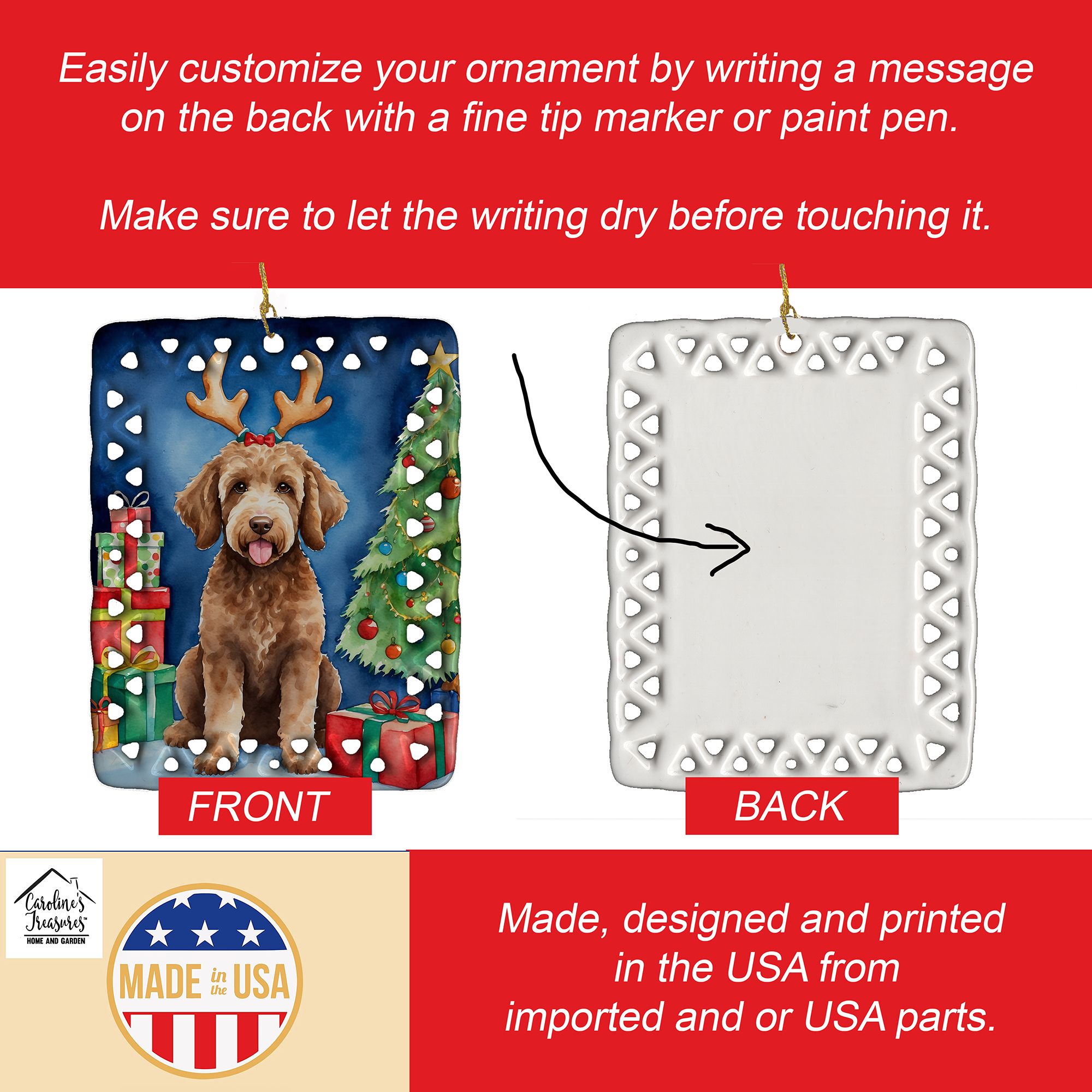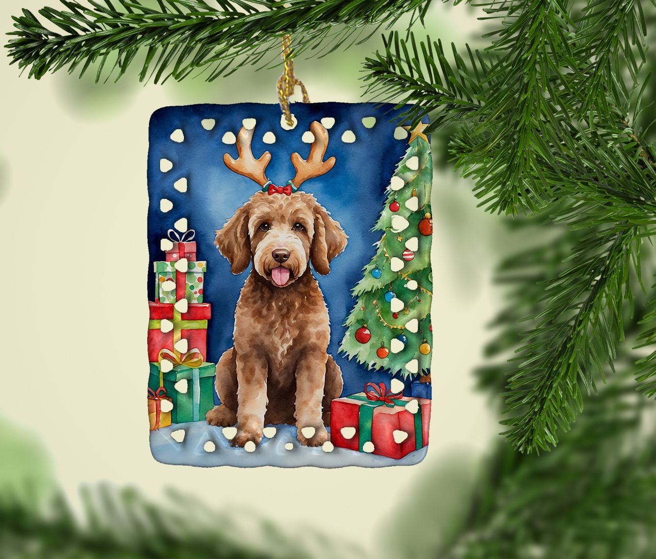 Porcelain Ornament featuring breed specific Labradoodle artwork. Celebrate Christmas with this Christmas Ornament. Add a unique, personal touch to your holiday decor with our Rectangular Lattice Porcelain Ornament. Perfect for creating cherished memories, this high-quality ornament shines under festive lights, reflecting warmth and joy throughout your Christmas tree. Crafted with a glossy finish, it showcases vibrant, full-color artwork contributed by our talented artists, ensuring your tree is adorned with a burst of color and holiday spirit. What sets this Porcelain Ornament apart is its customizable white back. Use a paint pen or permanent marker to write a heartfelt message, commemorate a special year, or mark an unforgettable date, turning this ornament into a keepsake that will be treasured for years to come. For best results, allow any personalization to dry thoroughly before handling. Each ornament comes complete with a delicate gold cord, making it easy to hang and display. Proudly made in the USA, this ornament measures 3.375 x 2.625 inches and is a thoughtful gift for pet sitters, teachers, family members, or anyone who would appreciate a little extra holiday magic. Bring style, charm, and a touch of personal meaning to your Christmas tree with this beautifully designed ornament..