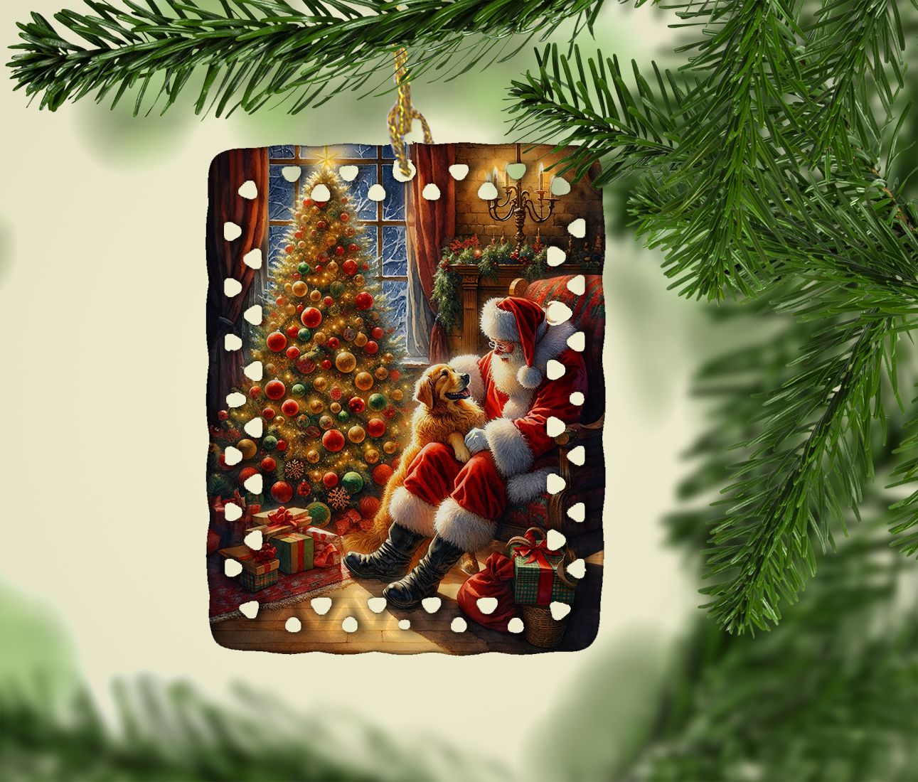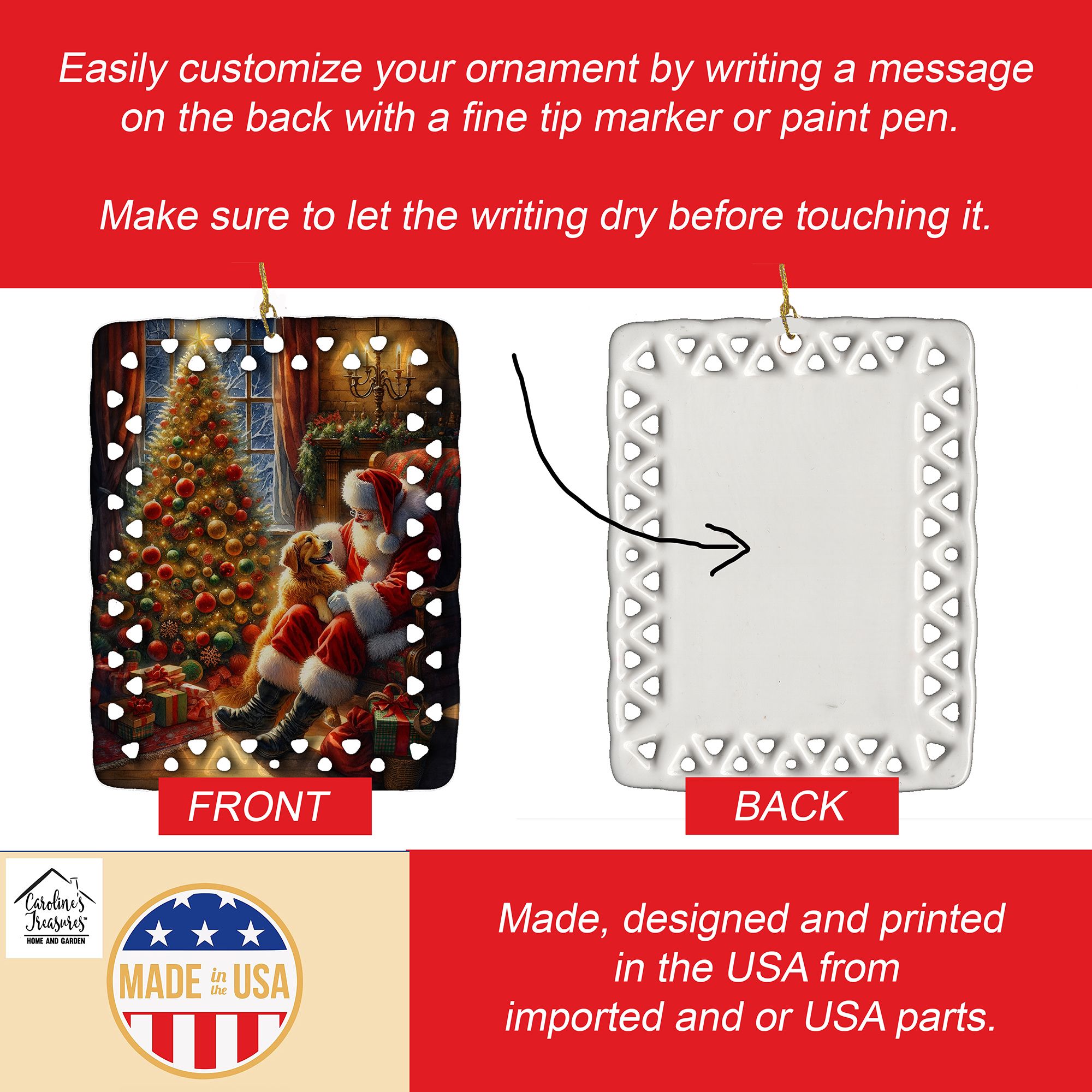 Porcelain Ornament featuring breed specific Golden Retriever artwork. Celebrate Christmas with this Christmas Ornament. Add a unique, personal touch to your holiday decor with our Rectangular Lattice Porcelain Ornament. Perfect for creating cherished memories, this high-quality ornament shines under festive lights, reflecting warmth and joy throughout your Christmas tree. Crafted with a glossy finish, it showcases vibrant, full-color artwork contributed by our talented artists, ensuring your tree is adorned with a burst of color and holiday spirit. What sets this Porcelain Ornament apart is its customizable white back. Use a paint pen or permanent marker to write a heartfelt message, commemorate a special year, or mark an unforgettable date, turning this ornament into a keepsake that will be treasured for years to come. For best results, allow any personalization to dry thoroughly before handling. Each ornament comes complete with a delicate gold cord, making it easy to hang and display. Proudly made in the USA, this ornament measures 3.375 x 2.625 inches and is a thoughtful gift for pet sitters, teachers, family members, or anyone who would appreciate a little extra holiday magic. Bring style, charm, and a touch of personal meaning to your Christmas tree with this beautifully designed ornament..