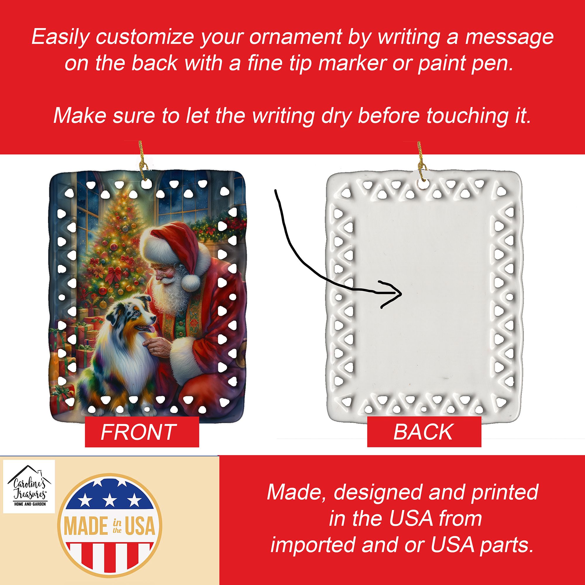 Porcelain Ornament featuring breed specific Australian Shepherd artwork. Celebrate Christmas with this Christmas Ornament. Add a unique, personal touch to your holiday decor with our Rectangular Lattice Porcelain Ornament. Perfect for creating cherished memories, this high-quality ornament shines under festive lights, reflecting warmth and joy throughout your Christmas tree. Crafted with a glossy finish, it showcases vibrant, full-color artwork contributed by our talented artists, ensuring your tree is adorned with a burst of color and holiday spirit. What sets this Porcelain Ornament apart is its customizable white back. Use a paint pen or permanent marker to write a heartfelt message, commemorate a special year, or mark an unforgettable date, turning this ornament into a keepsake that will be treasured for years to come. For best results, allow any personalization to dry thoroughly before handling. Each ornament comes complete with a delicate gold cord, making it easy to hang and display. Proudly made in the USA, this ornament measures 3.375 x 2.625 inches and is a thoughtful gift for pet sitters, teachers, family members, or anyone who would appreciate a little extra holiday magic. Bring style, charm, and a touch of personal meaning to your Christmas tree with this beautifully designed ornament..