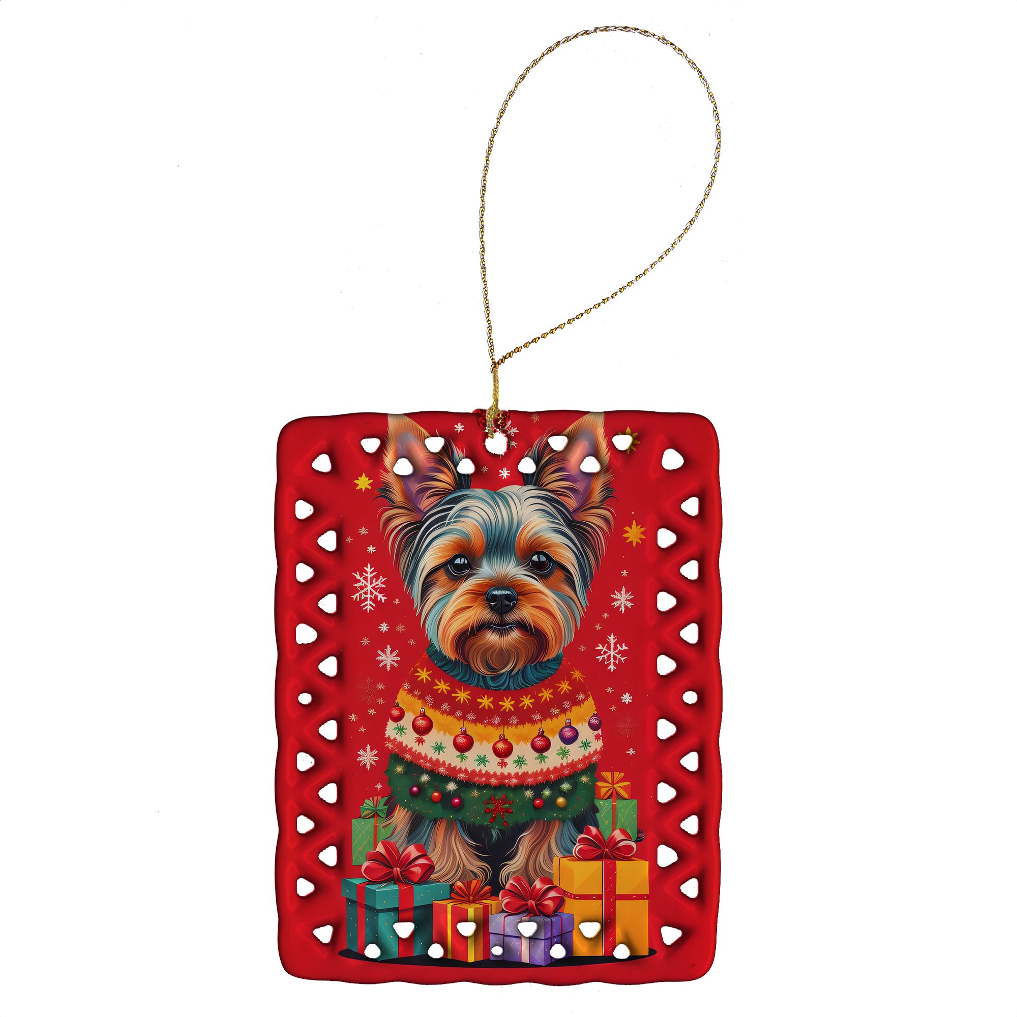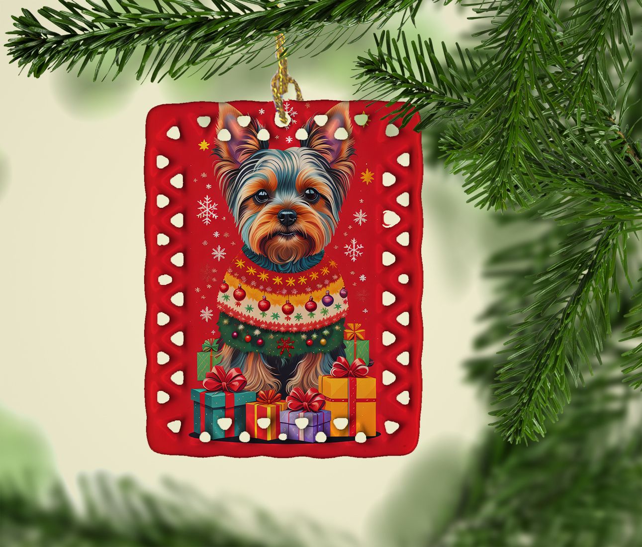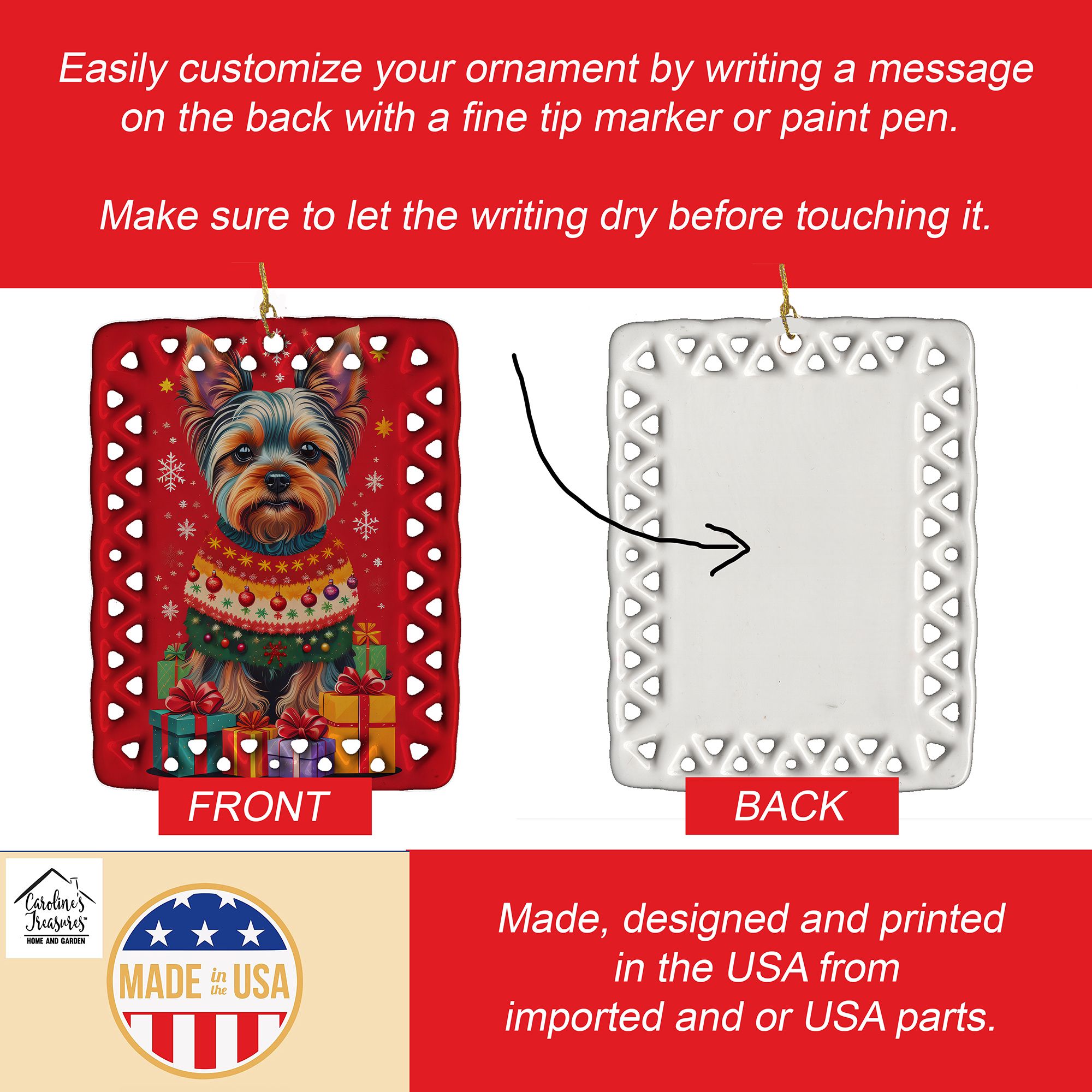 Porcelain Ornament featuring breed specific Yorkshire Terrier Yorkie artwork. Celebrate Christmas with this Christmas Ornament. Add a unique, personal touch to your holiday decor with our Rectangular Lattice Porcelain Ornament. Perfect for creating cherished memories, this high-quality ornament shines under festive lights, reflecting warmth and joy throughout your Christmas tree. Crafted with a glossy finish, it showcases vibrant, full-color artwork contributed by our talented artists, ensuring your tree is adorned with a burst of color and holiday spirit. What sets this Porcelain Ornament apart is its customizable white back. Use a paint pen or permanent marker to write a heartfelt message, commemorate a special year, or mark an unforgettable date, turning this ornament into a keepsake that will be treasured for years to come. For best results, allow any personalization to dry thoroughly before handling. Each ornament comes complete with a delicate gold cord, making it easy to hang and display. Proudly made in the USA, this ornament measures 3.375 x 2.625 inches and is a thoughtful gift for pet sitters, teachers, family members, or anyone who would appreciate a little extra holiday magic. Bring style, charm, and a touch of personal meaning to your Christmas tree with this beautifully designed ornament..