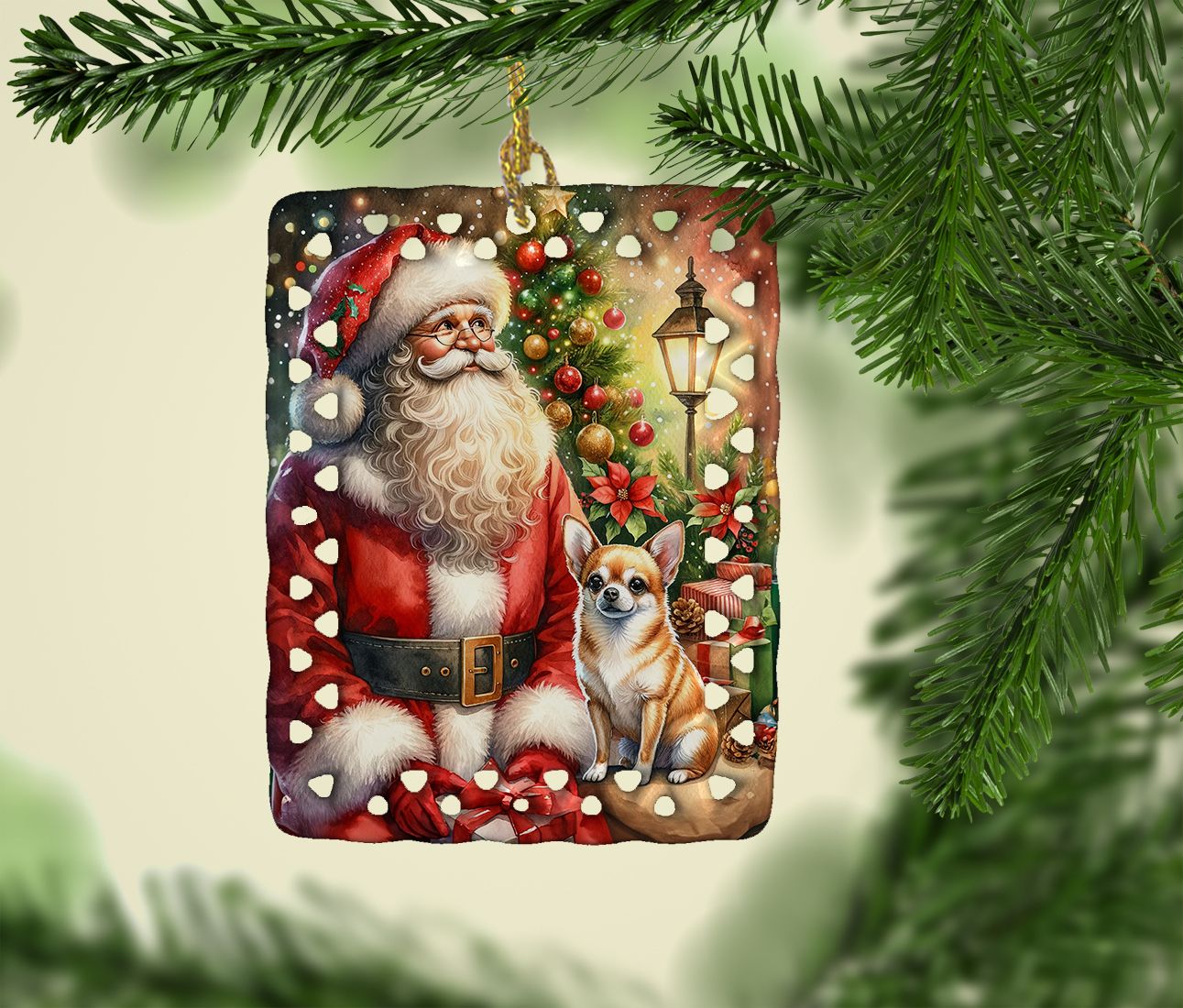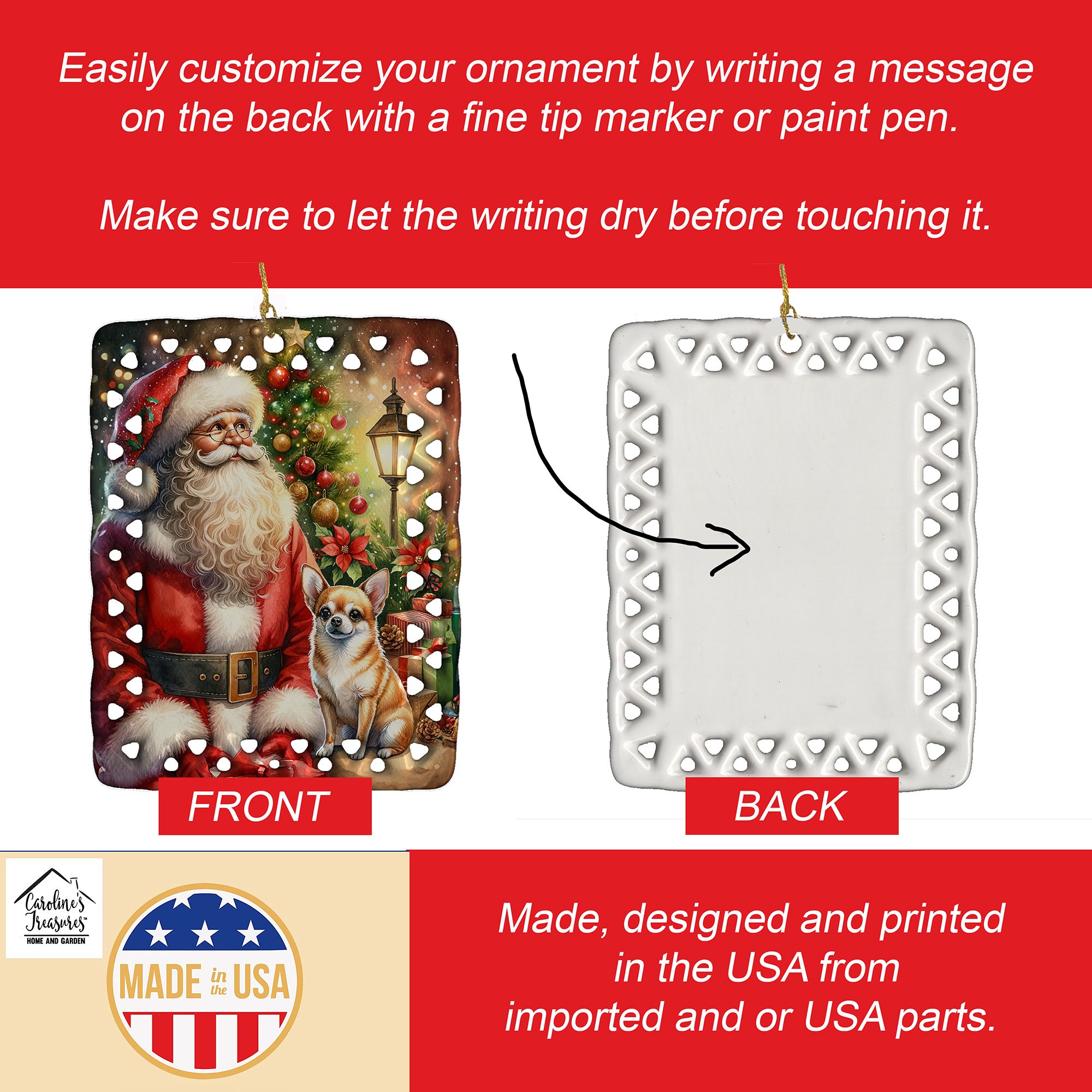 Porcelain Ornament featuring breed specific Chihuahua artwork. Celebrate Christmas with this Christmas Ornament. Add a unique, personal touch to your holiday decor with our Rectangular Lattice Porcelain Ornament. Perfect for creating cherished memories, this high-quality ornament shines under festive lights, reflecting warmth and joy throughout your Christmas tree. Crafted with a glossy finish, it showcases vibrant, full-color artwork contributed by our talented artists, ensuring your tree is adorned with a burst of color and holiday spirit. What sets this Porcelain Ornament apart is its customizable white back. Use a paint pen or permanent marker to write a heartfelt message, commemorate a special year, or mark an unforgettable date, turning this ornament into a keepsake that will be treasured for years to come. For best results, allow any personalization to dry thoroughly before handling. Each ornament comes complete with a delicate gold cord, making it easy to hang and display. Proudly made in the USA, this ornament measures 3.375 x 2.625 inches and is a thoughtful gift for pet sitters, teachers, family members, or anyone who would appreciate a little extra holiday magic. Bring style, charm, and a touch of personal meaning to your Christmas tree with this beautifully designed ornament..