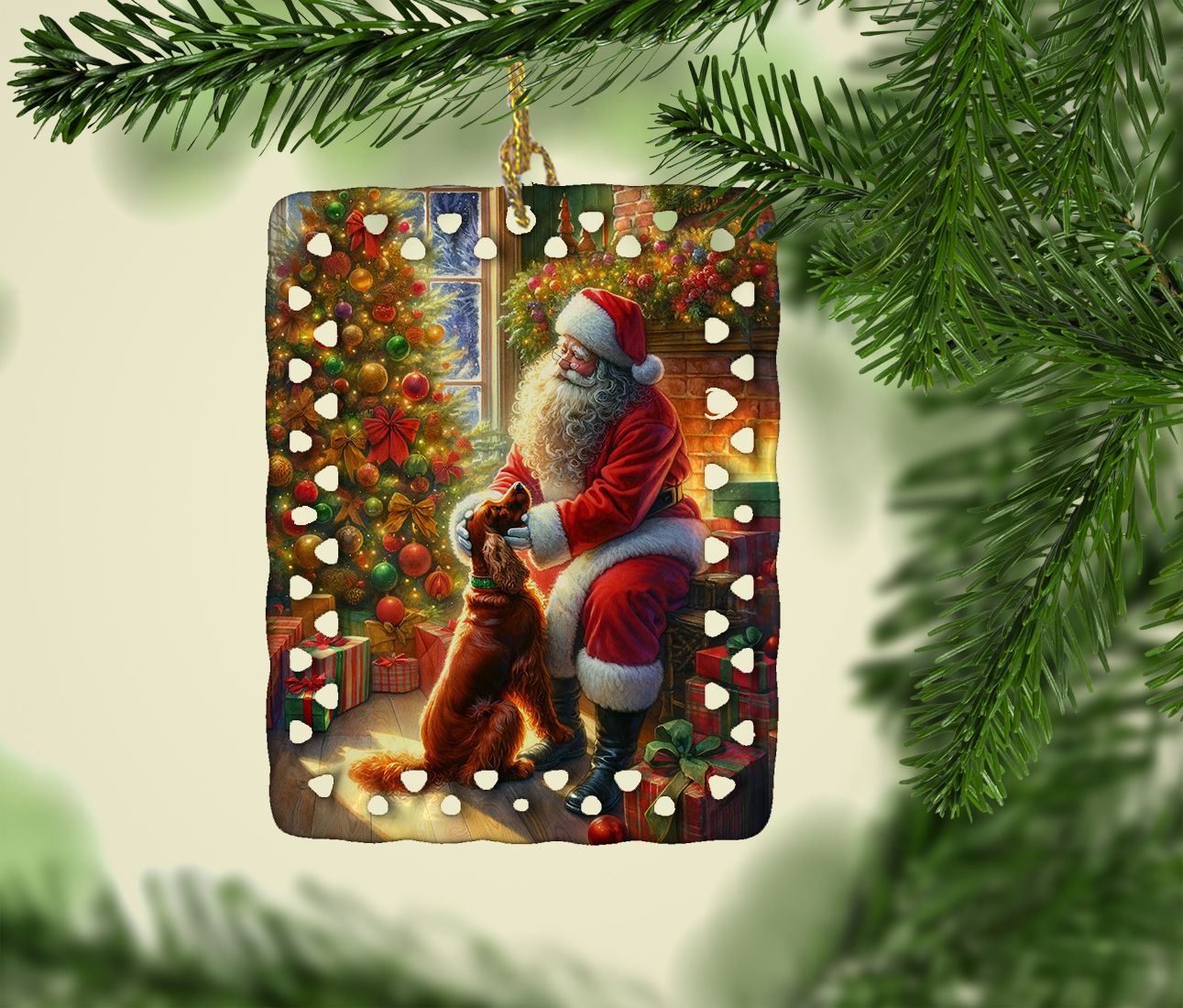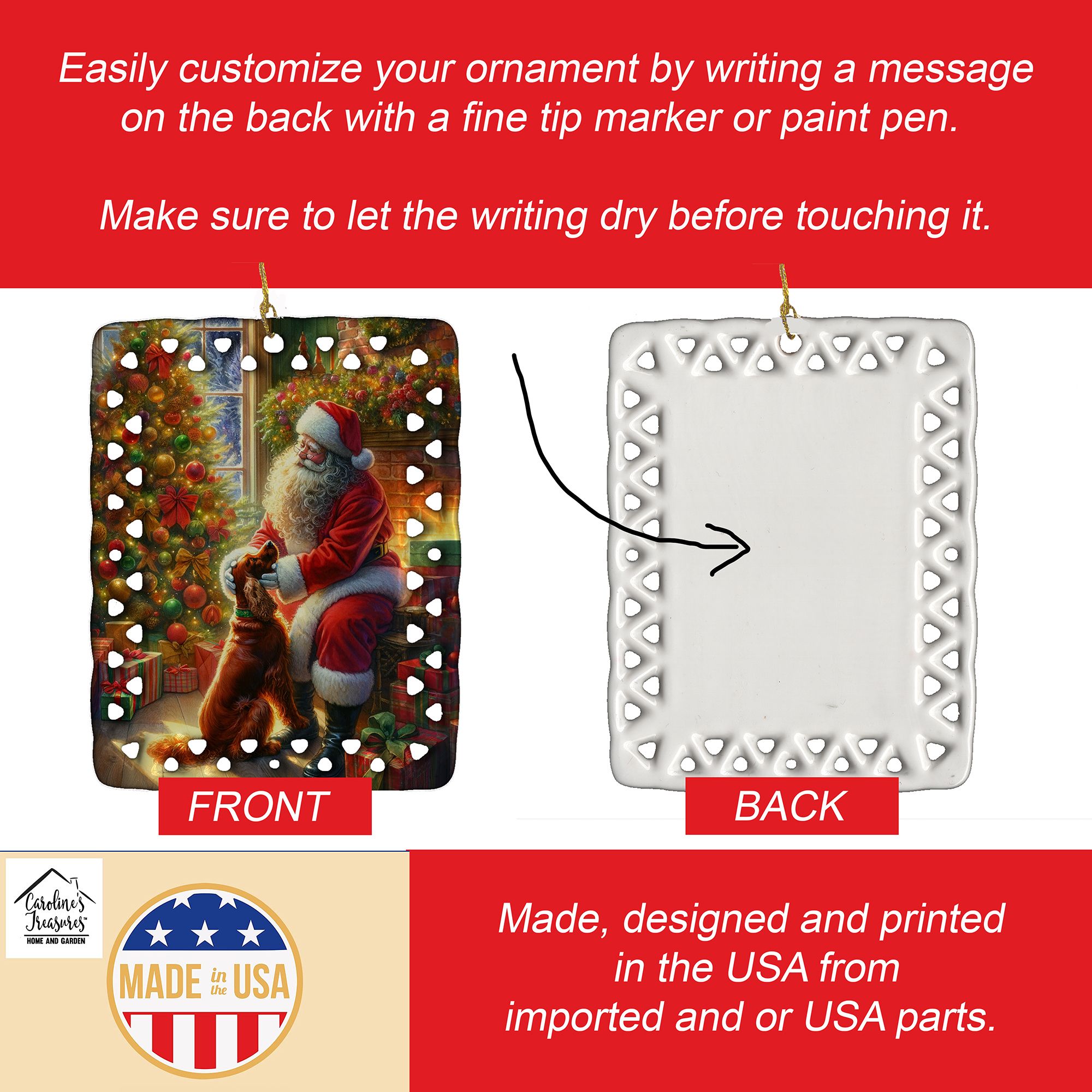 Porcelain Ornament featuring breed specific Irish Setter artwork. Celebrate Christmas with this Christmas Ornament. Add a unique, personal touch to your holiday decor with our Rectangular Lattice Porcelain Ornament. Perfect for creating cherished memories, this high-quality ornament shines under festive lights, reflecting warmth and joy throughout your Christmas tree. Crafted with a glossy finish, it showcases vibrant, full-color artwork contributed by our talented artists, ensuring your tree is adorned with a burst of color and holiday spirit. What sets this Porcelain Ornament apart is its customizable white back. Use a paint pen or permanent marker to write a heartfelt message, commemorate a special year, or mark an unforgettable date, turning this ornament into a keepsake that will be treasured for years to come. For best results, allow any personalization to dry thoroughly before handling. Each ornament comes complete with a delicate gold cord, making it easy to hang and display. Proudly made in the USA, this ornament measures 3.375 x 2.625 inches and is a thoughtful gift for pet sitters, teachers, family members, or anyone who would appreciate a little extra holiday magic. Bring style, charm, and a touch of personal meaning to your Christmas tree with this beautifully designed ornament..