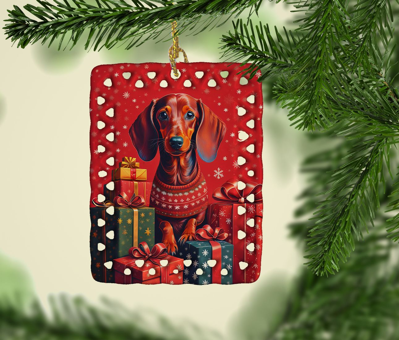 Porcelain Ornament featuring breed specific Dachshund artwork. Celebrate Christmas with this Christmas Ornament. Add a unique, personal touch to your holiday decor with our Rectangular Lattice Porcelain Ornament. Perfect for creating cherished memories, this high-quality ornament shines under festive lights, reflecting warmth and joy throughout your Christmas tree. Crafted with a glossy finish, it showcases vibrant, full-color artwork contributed by our talented artists, ensuring your tree is adorned with a burst of color and holiday spirit. What sets this Porcelain Ornament apart is its customizable white back. Use a paint pen or permanent marker to write a heartfelt message, commemorate a special year, or mark an unforgettable date, turning this ornament into a keepsake that will be treasured for years to come. For best results, allow any personalization to dry thoroughly before handling. Each ornament comes complete with a delicate gold cord, making it easy to hang and display. Proudly made in the USA, this ornament measures 3.375 x 2.625 inches and is a thoughtful gift for pet sitters, teachers, family members, or anyone who would appreciate a little extra holiday magic. Bring style, charm, and a touch of personal meaning to your Christmas tree with this beautifully designed ornament..