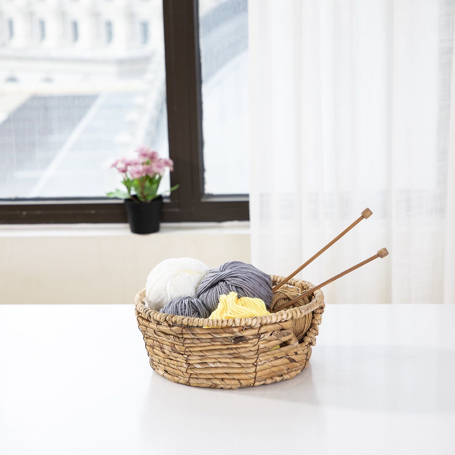 Round Water Hyacinth Woven Decorative Storage Basket is the perfect option for all of your every day needs. This gorgeous, handcrafted basket is made of water hyacinth woven in a plain weave design around a sturdy iron frame. This basket is light weight, and measures 10"D x 4"H. Use this versatile basket to declutter small items, to hold artificial plants, or get creative by using it to hold napkins at a party or your favorite wrapped candies. This basket was created with longevity in mind. The classic design will not go out of style. The quality will allow you to use this basket for years to come.