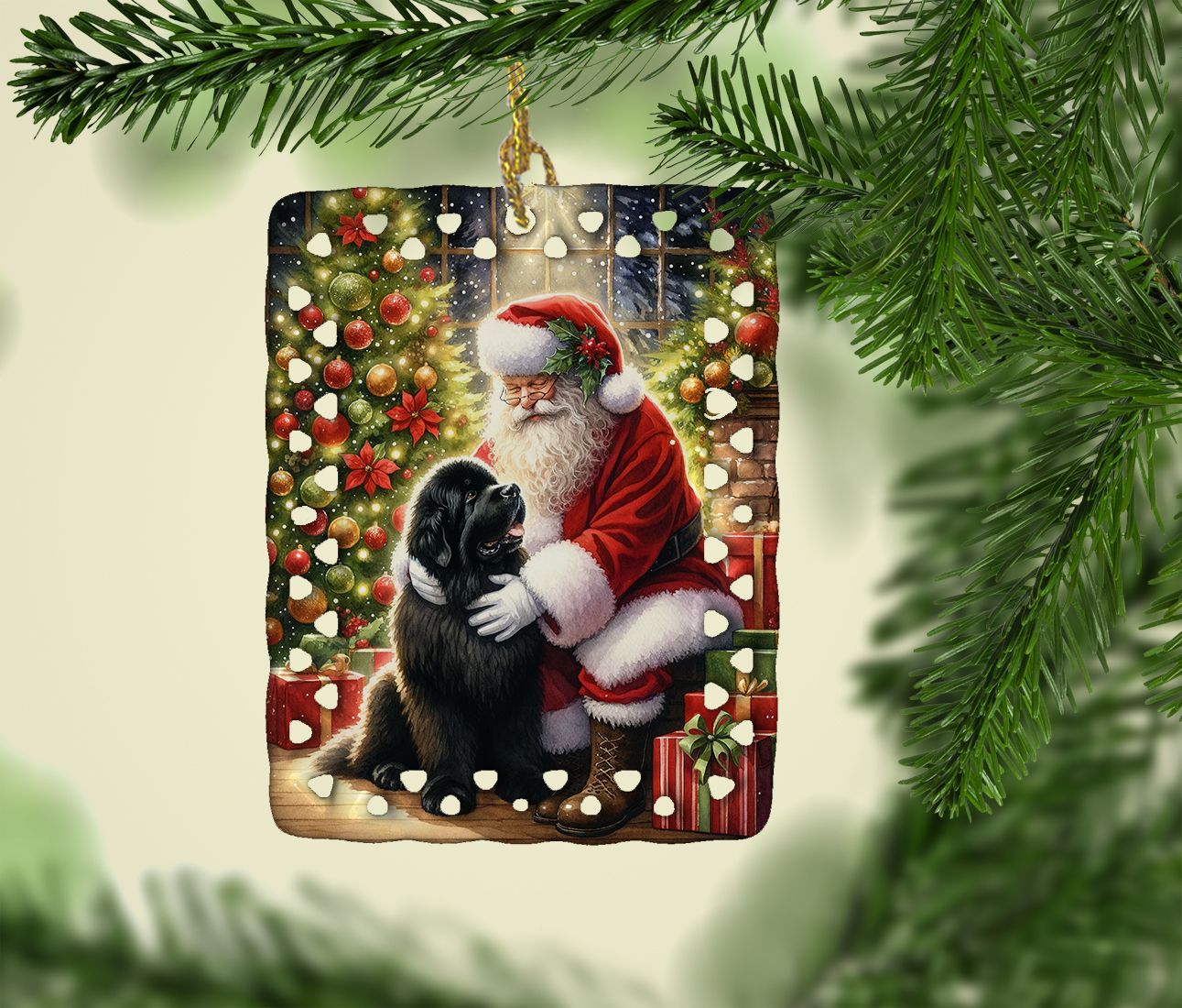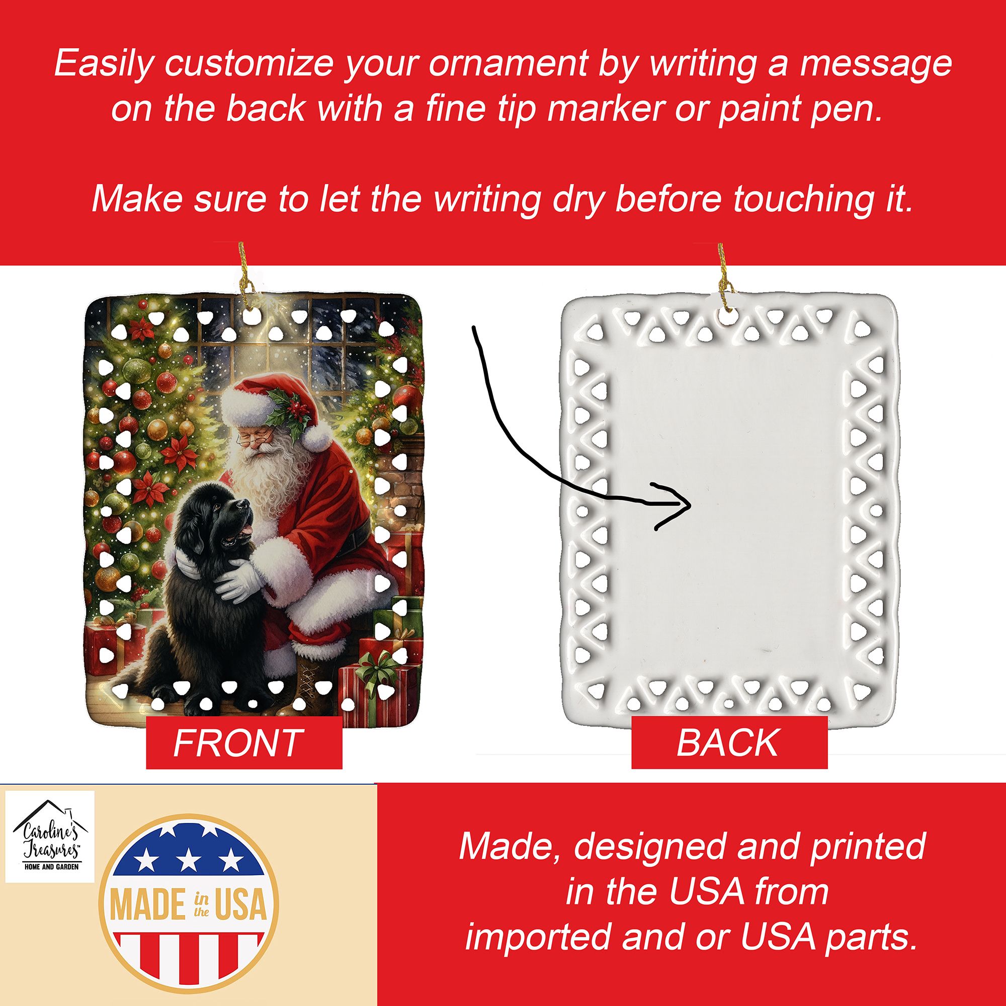 Porcelain Ornament featuring breed specific Newfoundland artwork. Celebrate Christmas with this Christmas Ornament. Add a unique, personal touch to your holiday decor with our Rectangular Lattice Porcelain Ornament. Perfect for creating cherished memories, this high-quality ornament shines under festive lights, reflecting warmth and joy throughout your Christmas tree. Crafted with a glossy finish, it showcases vibrant, full-color artwork contributed by our talented artists, ensuring your tree is adorned with a burst of color and holiday spirit. What sets this Porcelain Ornament apart is its customizable white back. Use a paint pen or permanent marker to write a heartfelt message, commemorate a special year, or mark an unforgettable date, turning this ornament into a keepsake that will be treasured for years to come. For best results, allow any personalization to dry thoroughly before handling. Each ornament comes complete with a delicate gold cord, making it easy to hang and display. Proudly made in the USA, this ornament measures 3.375 x 2.625 inches and is a thoughtful gift for pet sitters, teachers, family members, or anyone who would appreciate a little extra holiday magic. Bring style, charm, and a touch of personal meaning to your Christmas tree with this beautifully designed ornament..