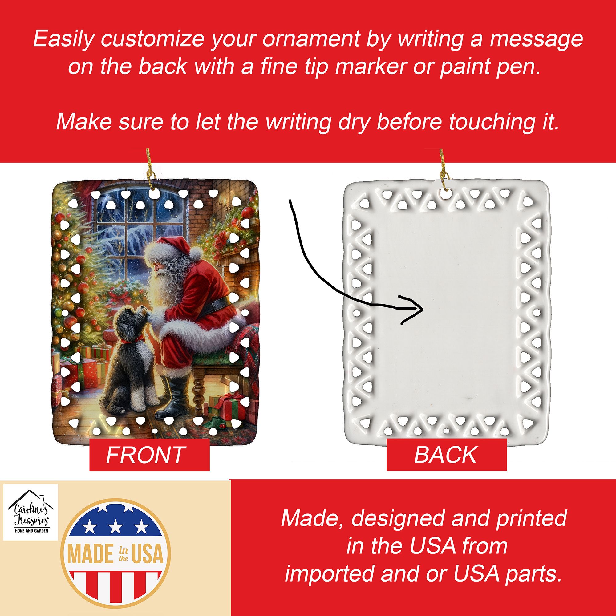 Porcelain Ornament featuring breed specific Portuguese Water Dog artwork. Celebrate Christmas with this Christmas Ornament. Add a unique, personal touch to your holiday decor with our Rectangular Lattice Porcelain Ornament. Perfect for creating cherished memories, this high-quality ornament shines under festive lights, reflecting warmth and joy throughout your Christmas tree. Crafted with a glossy finish, it showcases vibrant, full-color artwork contributed by our talented artists, ensuring your tree is adorned with a burst of color and holiday spirit. What sets this Porcelain Ornament apart is its customizable white back. Use a paint pen or permanent marker to write a heartfelt message, commemorate a special year, or mark an unforgettable date, turning this ornament into a keepsake that will be treasured for years to come. For best results, allow any personalization to dry thoroughly before handling. Each ornament comes complete with a delicate gold cord, making it easy to hang and display. Proudly made in the USA, this ornament measures 3.375 x 2.625 inches and is a thoughtful gift for pet sitters, teachers, family members, or anyone who would appreciate a little extra holiday magic. Bring style, charm, and a touch of personal meaning to your Christmas tree with this beautifully designed ornament..