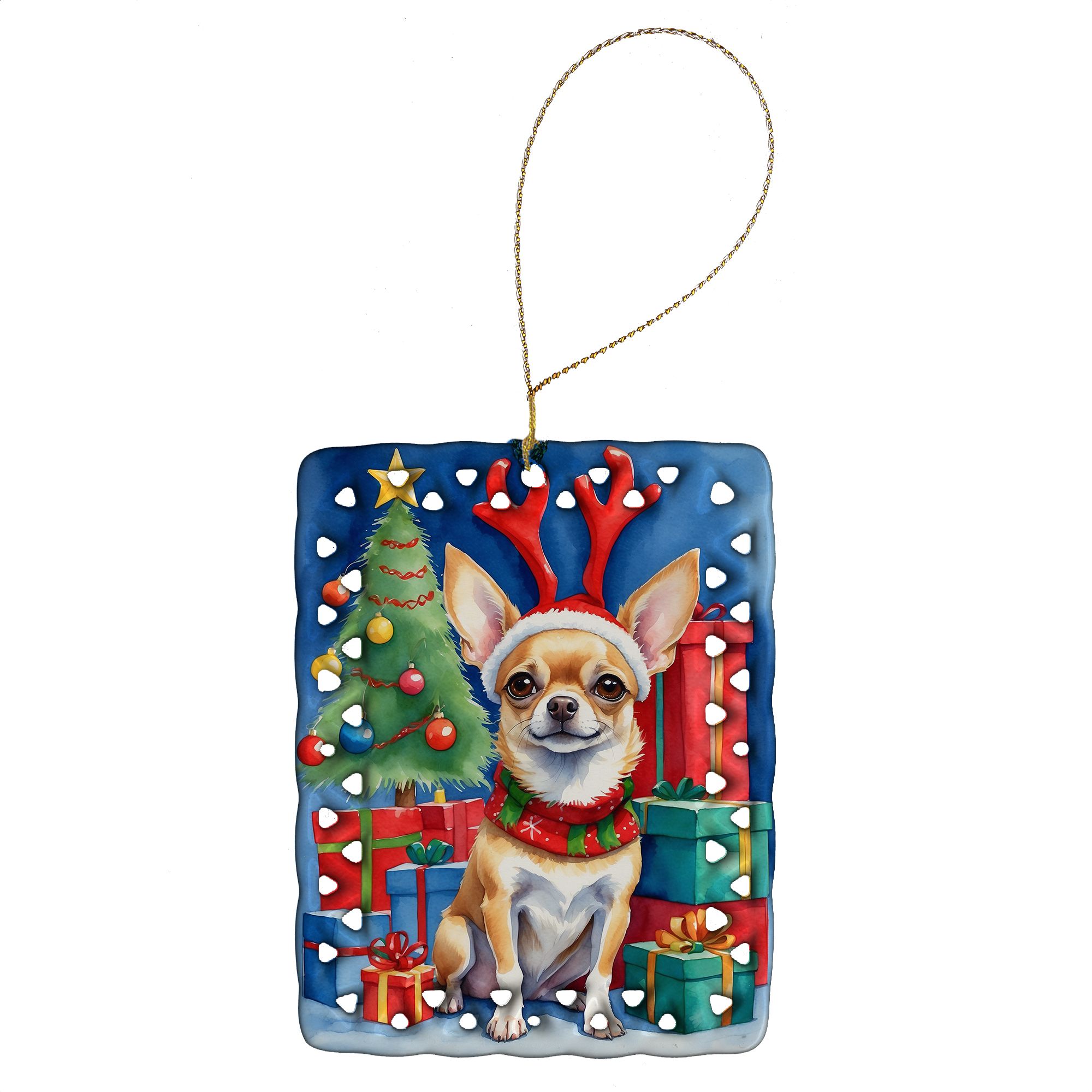 Porcelain Ornament featuring breed specific Chihuahua artwork. Celebrate Christmas with this Christmas Ornament. Add a unique, personal touch to your holiday decor with our Rectangular Lattice Porcelain Ornament. Perfect for creating cherished memories, this high-quality ornament shines under festive lights, reflecting warmth and joy throughout your Christmas tree. Crafted with a glossy finish, it showcases vibrant, full-color artwork contributed by our talented artists, ensuring your tree is adorned with a burst of color and holiday spirit. What sets this Porcelain Ornament apart is its customizable white back. Use a paint pen or permanent marker to write a heartfelt message, commemorate a special year, or mark an unforgettable date, turning this ornament into a keepsake that will be treasured for years to come. For best results, allow any personalization to dry thoroughly before handling. Each ornament comes complete with a delicate gold cord, making it easy to hang and display. Proudly made in the USA, this ornament measures 3.375 x 2.625 inches and is a thoughtful gift for pet sitters, teachers, family members, or anyone who would appreciate a little extra holiday magic. Bring style, charm, and a touch of personal meaning to your Christmas tree with this beautifully designed ornament..